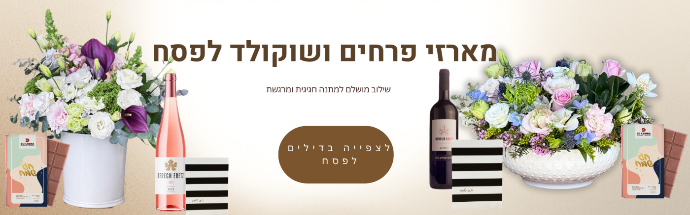 חבילות משתלמות לפסח– מתנות מוכנות שמשלבות פרחים, שוקולד ותוספות אהובות. בחירה מושלמת למי שרוצה מתנה מרשימה בלי לחשוב פעמיים.