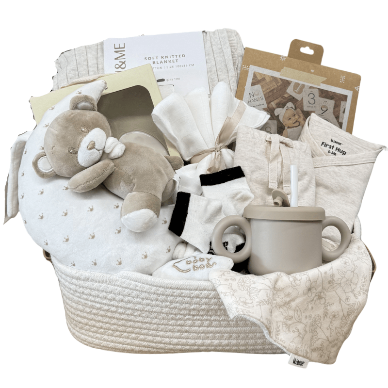 מארז מתנה קלאסי ומרגש בגוונים חמימים ונייטרלים- מושל לתינוקות רכים- בן ובת. המארז כולל שמיכה סרוגה, מובייל ירח עם דובי מנגן, בגדים איכותיים, כוס למידה, חיתול טטרה, סט מברשות שיער, גרביים, סט צילום לשנה הראשונה, מגיע בסל בד אלגנטי המשמש לאחסון ועיצוב בשולחן החתלה- מתנה מרשימה ואוהבת לרגעים הראשונים.