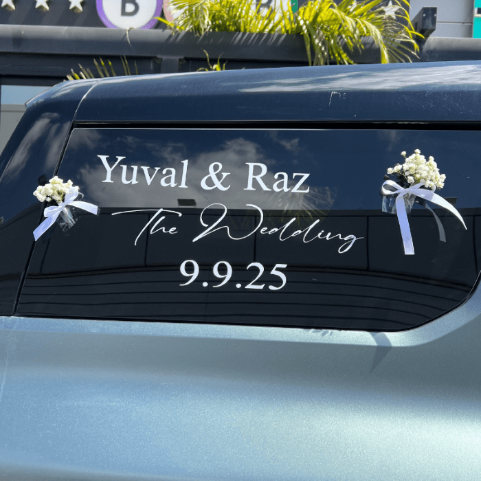 על השמשה האחורית כיתוב בהתאמה אישית.