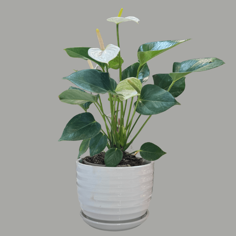 אנטוריום לבן בכלי קרמיקה אלגנטי, בעל פריחה עדינה ומראה נקי ומרשים. מתאים לעיצוב הבית או המשרד וכמתנה קלאסית עם נגיעה ירוקה.