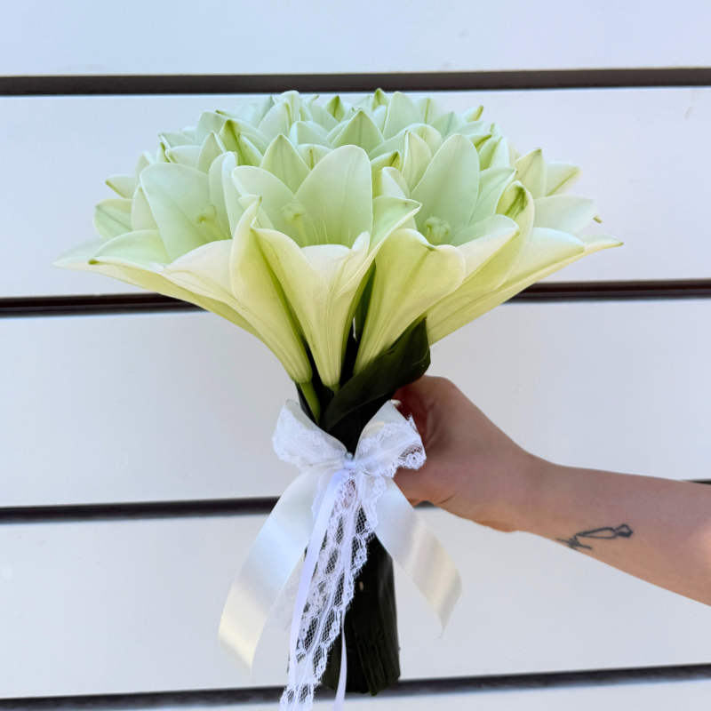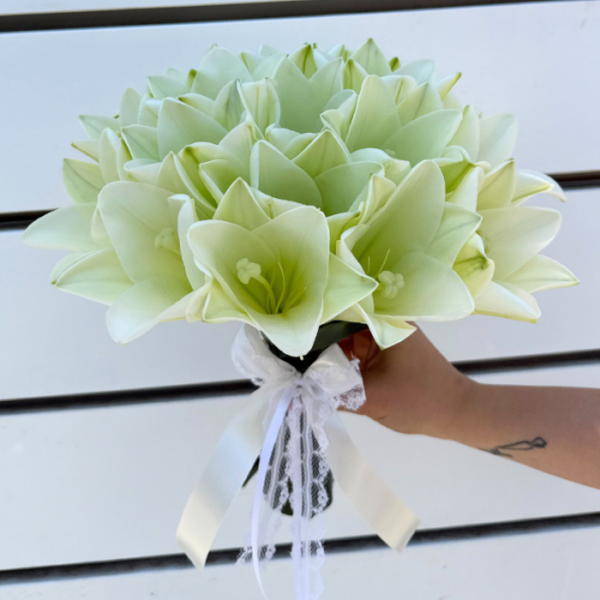 זר כלה משושן צחור ריחני משולב עם בד תחרה ובדי משי בידית הזר.