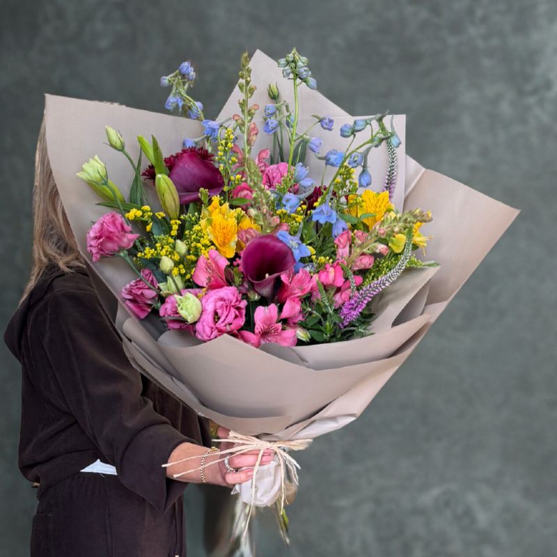 זר פרחים צבעוני ומרשים המשלב מגוון פרחים טבעיים בגוונים שונים בעיצוב טבעי ואלגנטי .