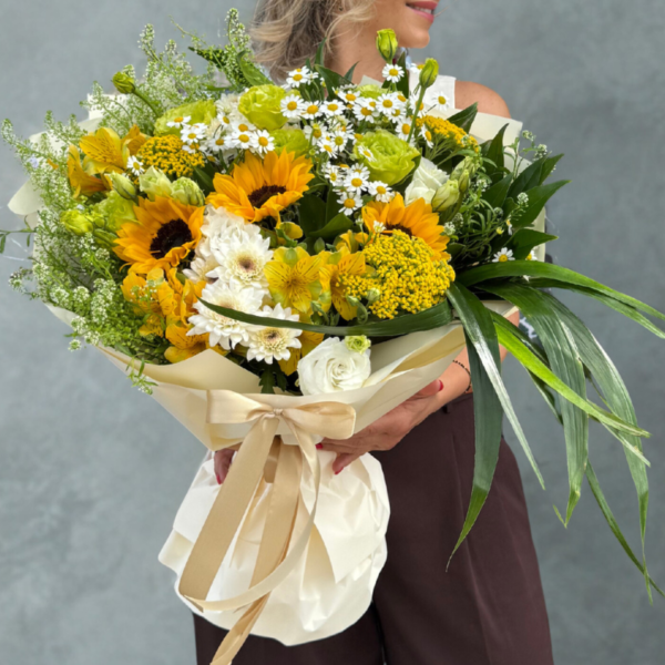 זר פרחים חגיגי ויוקרתי, המשלב מגוון צבעים וטקסטורות שקטות.