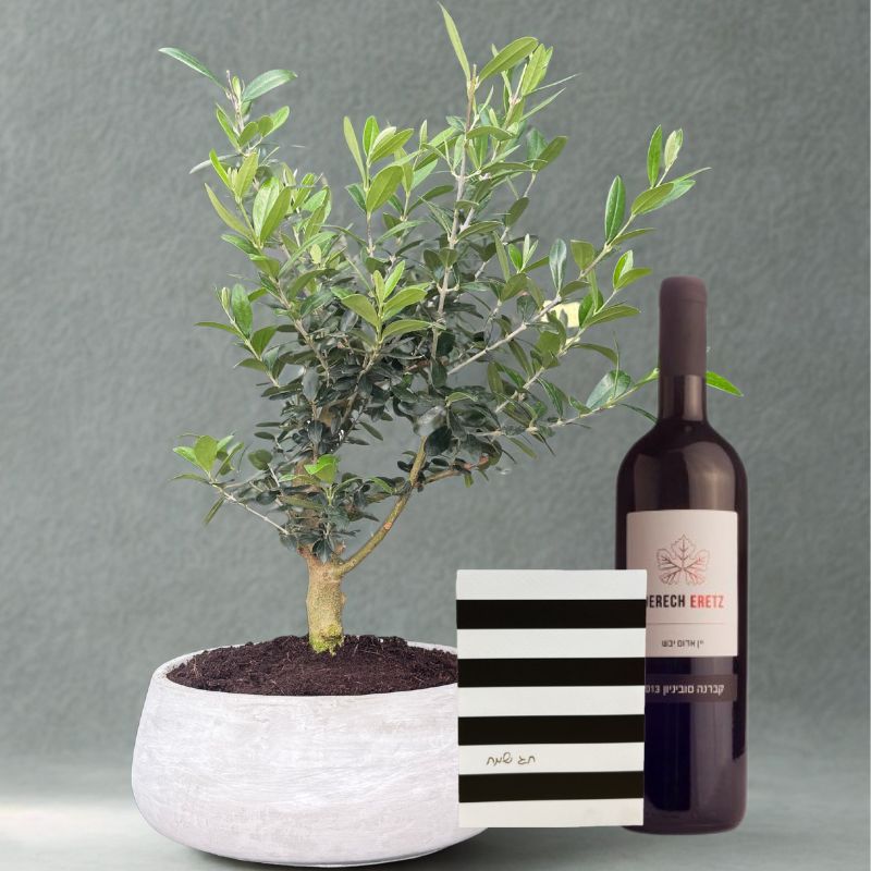 חבילת מתנה של עציץ זית טבעי בכלי בטון מעוצב, המשלב מראה ירוק, נקי ואלגנטי בתוספת בקבוק יין וכרטיס ברכה.