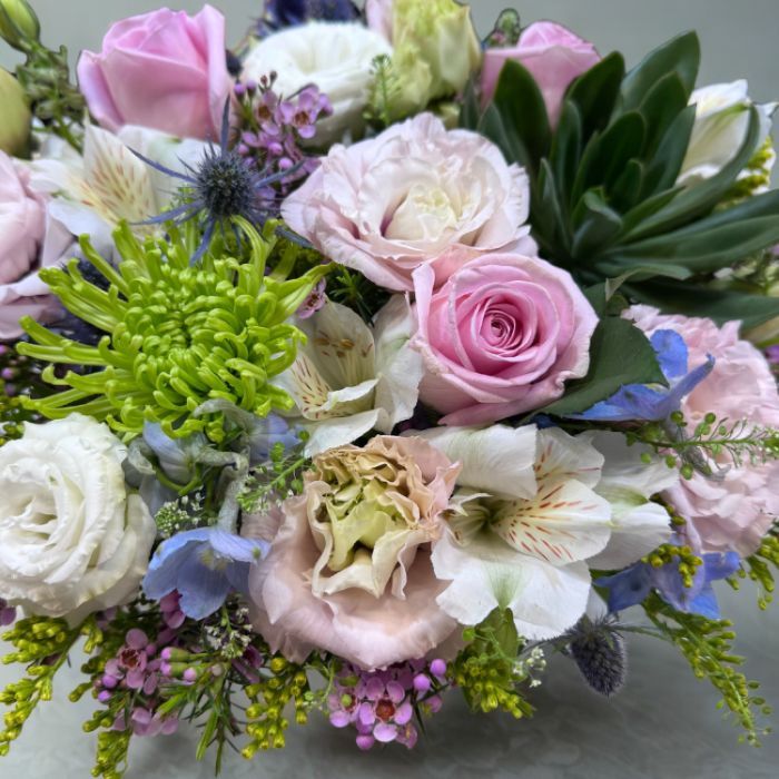 סידור פרחים מרהיב בגווני פסטל עדינים של ורוד, תכלת, לבן וירוק, המשלב פרחים טריים וסוקולנטים בעיצוב עשיר ורומנטי בתוך קערת קרמיקה לבנה.