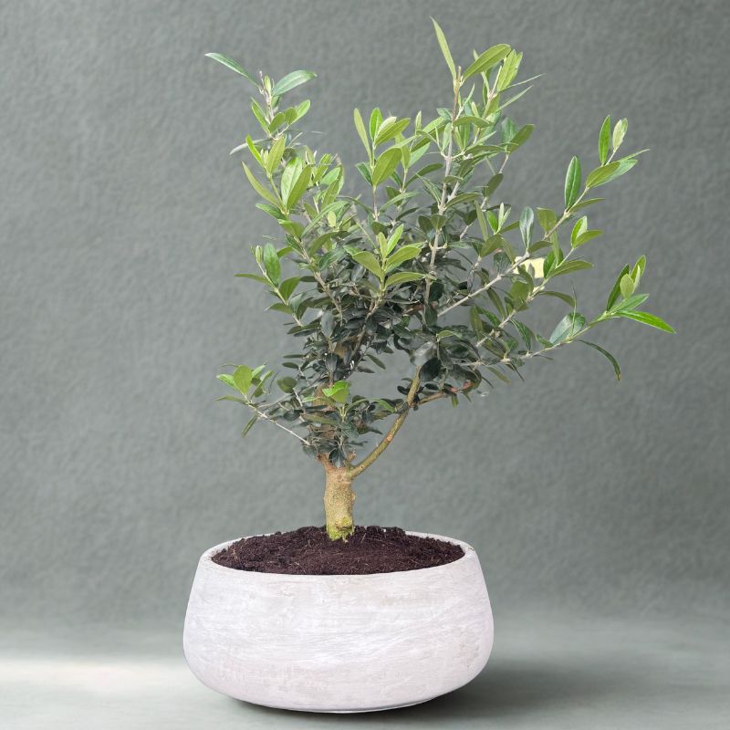 עציץ זית טבעי בכלי בטון מעוצב, המשלב מראה ירוק, נקי ואלגנטי.